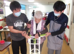 施設入居者のほとんどの方が、体力の低下した高齢者の方々で、一応にリハビリはしたくない。寝ていたいとニーズを訴えられる事が少なくありません。しかし、それにより本来の生活ニーズではなく、低体力における意欲の低下を引き起こしている事が多くあります。入居者の皆様もリハビリを始めると同時に生活の意欲が増し、より元気になりたいと歩行器訓練等に積極的に取り組まれています。